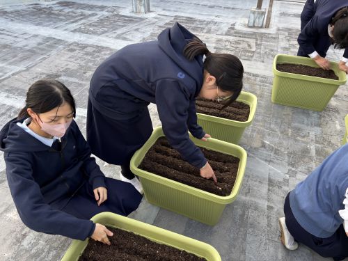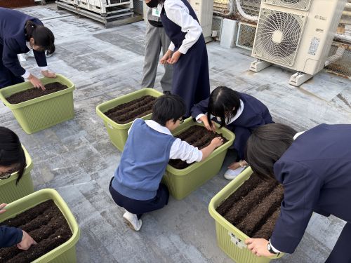 種子の消毒を行った後、播種を行いました。生物部の高校生も合流し播種を手伝ってくれました!