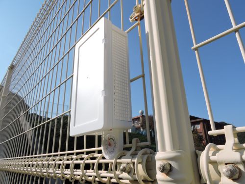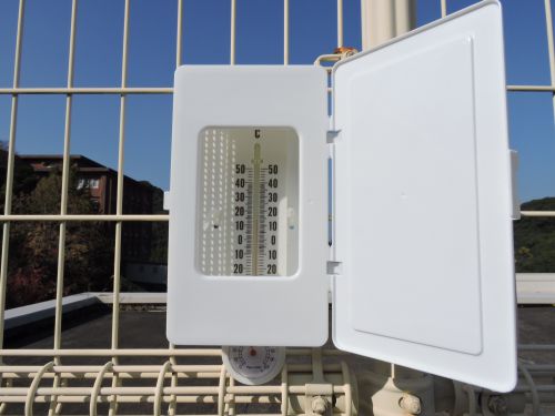 屋上フェンスに設置した湿度計付き温度計です。